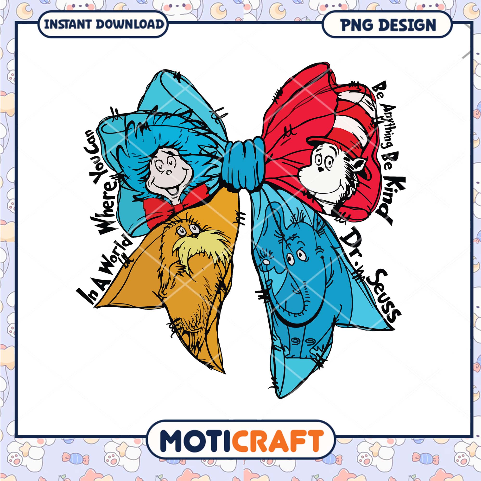 Dr Seuss Inspired Colorful Bow with Whimsical Characters PNG is part of our Dr. Seuss collection, featuring vibrant, high-quality designs inspired by Dr. Seuss’ beloved world. Perfect for crafts, digital design, and personal creations, these PNG files bring iconic characters like The Cat in the Hat, Horton, and the Grinch to life. With transparent backgrounds for easy layering, our Dr. Seuss PNG files are ideal for use in Cricut and Silhouette projects, custom t-shirts, mugs, and more. Whether you’re celebrating Read Across America or simply love Dr. Seuss’ quirky style, this collection offers endless creative possibilities for Seuss fans of all ages. Start crafting today!