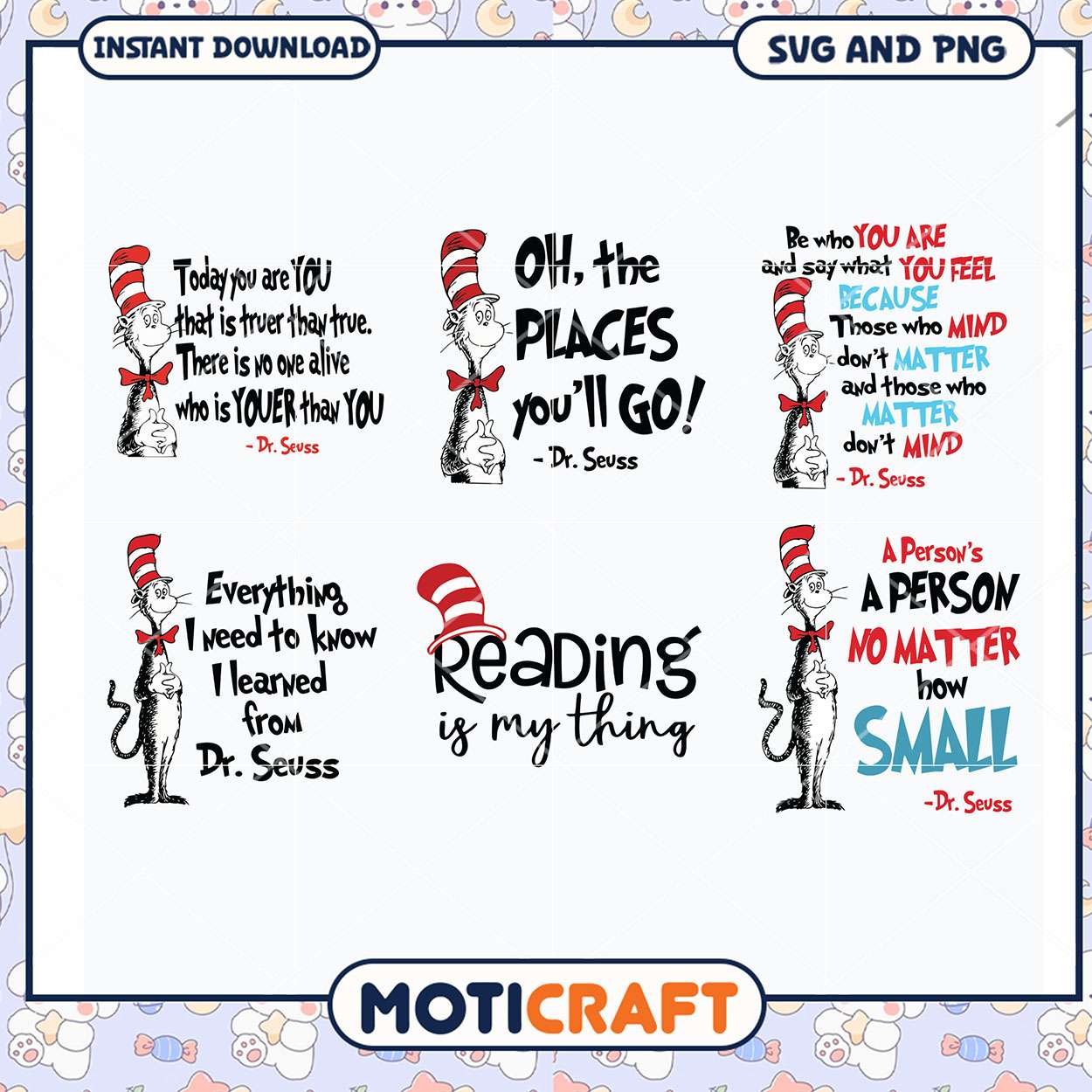 Dr Seuss Quotes SVG Collection is part of our enchanting Dr. Seuss collection, designed to bring the quirky world of Dr. Seuss into your creative projects. Featuring iconic characters like The Cat in the Hat, the Lorax, and the Grinch, these scalable vector graphics are perfect for Cricut, Silhouette, and other cutting machines. Ideal for creating personalized t-shirts, mugs, party favors, or classroom decorations, our Dr. Seuss SVG files are easy to use and ensure sharp, high-quality results every time.